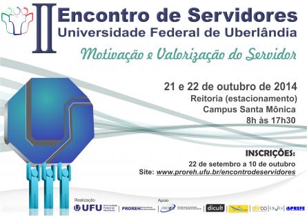 A Pró-Reitoria de Recursos Humanos (PROREH) realizará, nos dias 21 e 22 de outubro de 2014, em frente a Reitoria no Campus Santa Mônica, o II Encontro de Servidores da Universidade Federal de Uberlândia, com o tema central: Motivação e Valorização do Servidor.