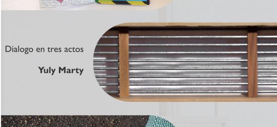 Já a artista Yuly Marty, também de Campinas, chega ao MUnA com "Dialogo em tres actos", que reúne três diferentes trabalhos. Em "poemas figurados", a palavra é explorada enquanto elemento visível, semi-oculto ou oculto. "Narrativas" são textos feitos na máquina de escrever, em materiais diferentes como papal craft e cera de abelha. Já "entrelíneas" apresenta extratos de textos junto a linhas de metal, convidando o espectador a se aproximar da obra para ler o que está escrito.