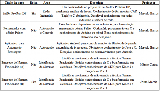 O período de inscrições está aberto até 20 de outubro e o devem ser enviados currículo (em arquivo formato .pdf, apenas uma página, com e-mail e telefone de contato) e histórico escolar com CRA (também em .pdf) pelo site do Lasec. Confira tabela com as vagas abaixo.