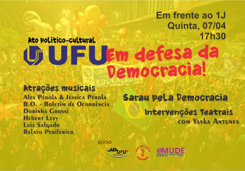 A Associação dos Docentes da Universidade Federal de Uberlândia (Adufu), o Sindicato dos Trabalhadores Técnico–Administrativos em Instituições Federais de Ensino Superior de Uberlândia (Sintet-UFU) e o Diretório Central dos Estudantes da Universidade Federal de Uberlândia (DCE-UFU) convidam a comunidade acadêmica e a população em geral para o ato político-cultural "UFU em Defesa da Democracia!". Este evento, que contará com apresentações de várias atividades artístico-culturais, ocorrerá nesta quinta-feira, 07/04, a partir das 17h30, em frente ao Bloco J do Campus Santa Mônica.