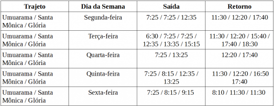 Já para o Campus Glória, o Intercampi faz um trajeto que sai do Campus Umuarama e passa pelo Campus Santa Mônica, nos seguintes horários: