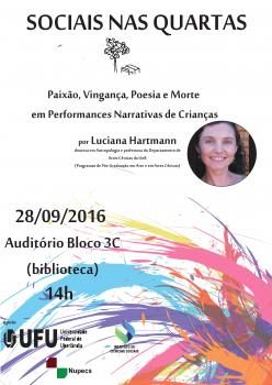 A atividade tem como tema “Paixão, vingança, poesia e morte em performances narrativas de crianças” e contará com palestra da docente do Departamento de Artes Cênicas da Universidade de Brasília, Luciana Hartmann. A professora propõe uma reflexão do tema com base em três experiências de pesquisa etnográfica, realizadas em escolas primárias de uma comunidade rural de Cerro Pelado (Uruguai), de uma cidade satélite de Brasília (Brasil) e na cidade de Paris (França).