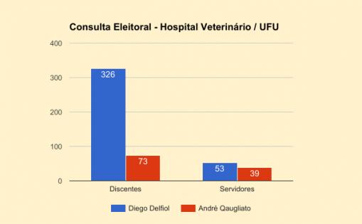 Considerando o critério de proporcionalidade (votos de servidores equivalem a 70% e de estudantes 30%), Diego Delfiou obteve 521 pontos e André Quagliato, 328,3 pontos.