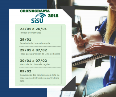 O período de inscrições para o SiSU é de 23 a 26 de janeiro de 2018. Os interessados devem confirmar a participação pelo seguinte endereço eletrônico: http://sisu.mec.gov.br . O candidato deve acessar o formulário com o número de inscrição e a senha cadastrada no Enem.