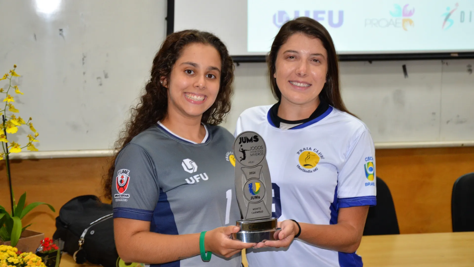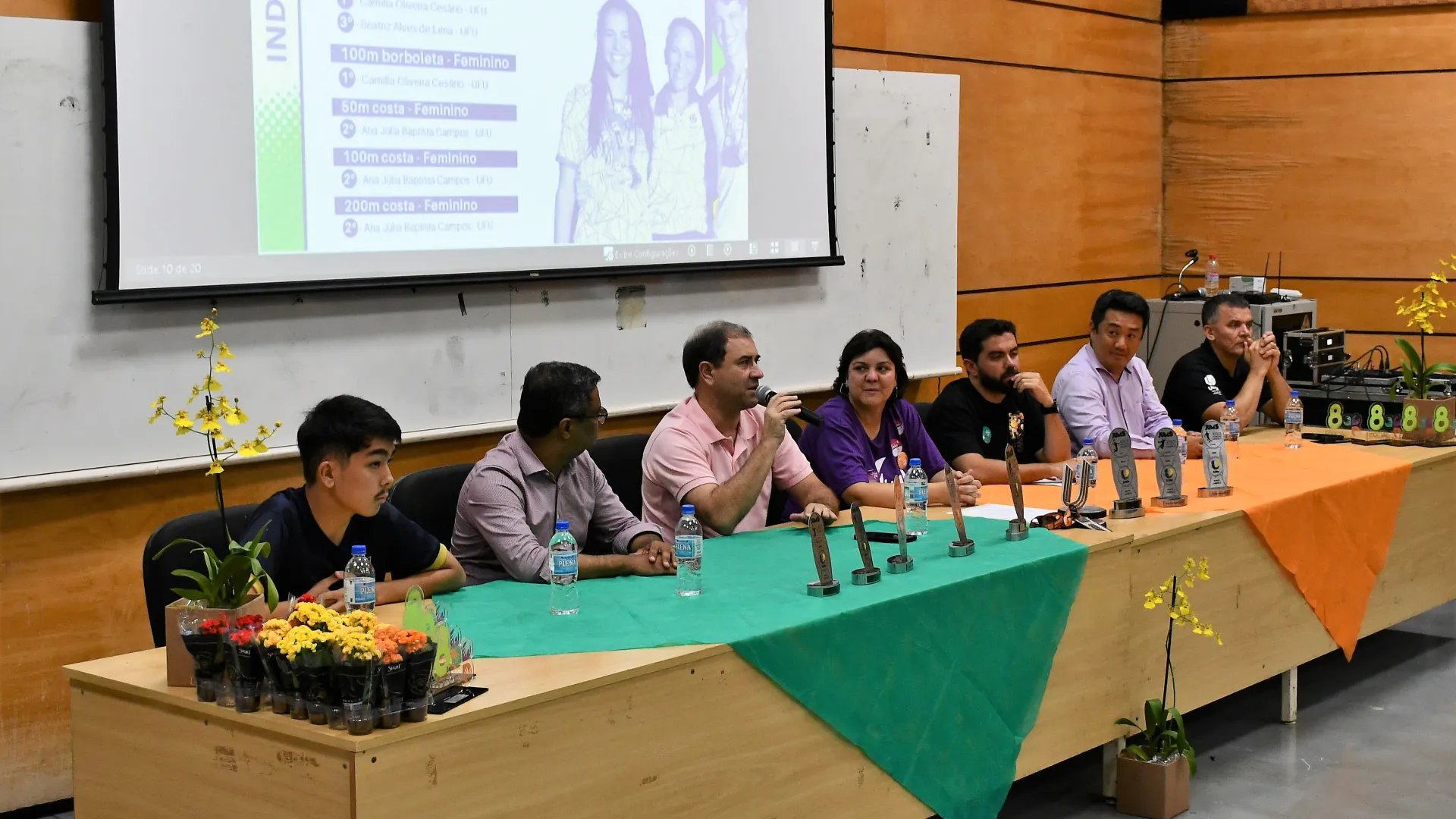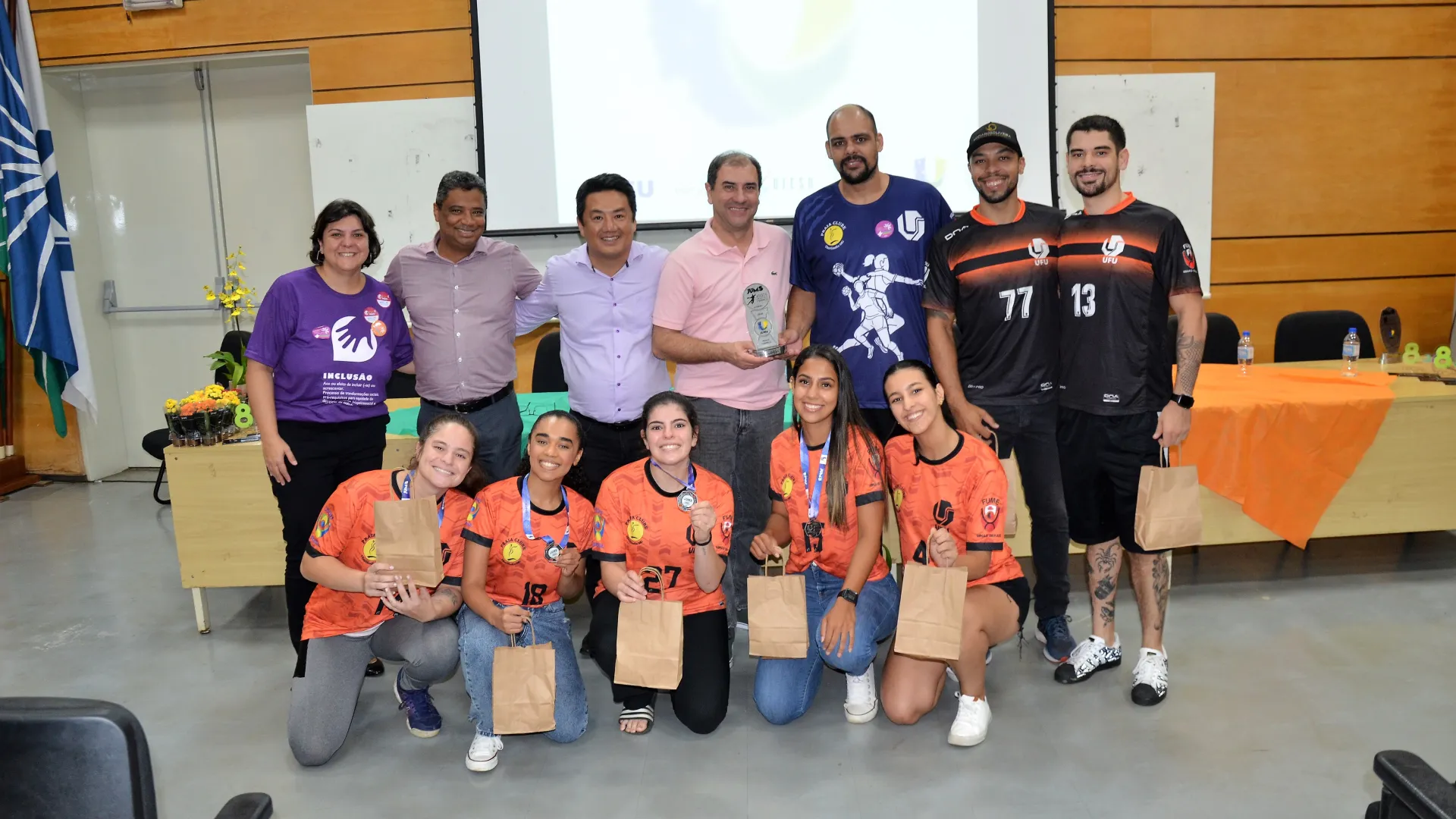 Participaram da cerimônia, além dos estudantes-atletas homenageados, a pró-reitora de Assistência Estudantil, Elaine Saraiva Calderari; o presidente do Praia Clube, Carlos Augusto Ferreira; o pró-reitor de Extensão e Cultura, Hélder Eterno da Silveira; o diretor da Diretoria de Qualidade de Vida do Estudante (Dirve), Claudio Gomes Barbosa; o coordenador da Divisão de Esporte e Lazer (Diesu), Adilson Henrique de Souza; o diretor da Faculdade de Educação Física e Fisioterapia (Faefi), Marcos Seizo Kishi; e o presidente da Liga das Atléticas da UFU (Laufu), Leonardo Yamaguti.
