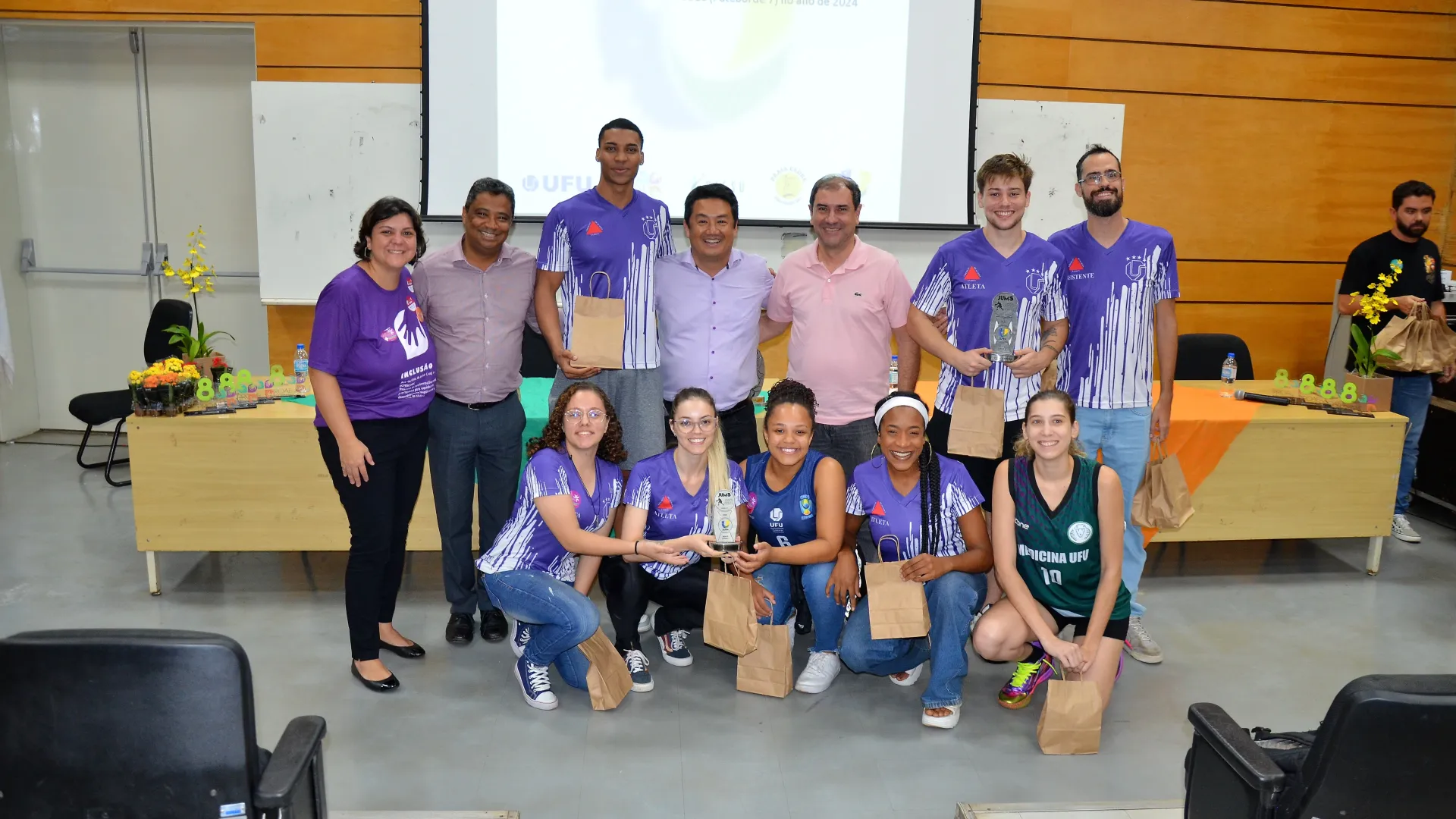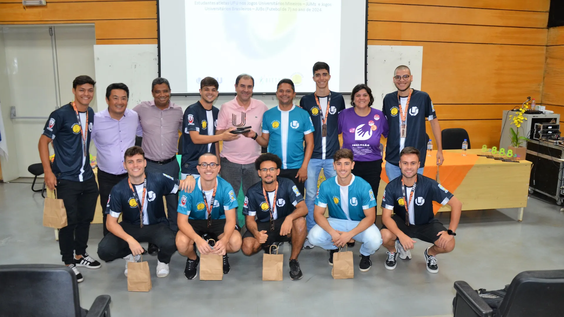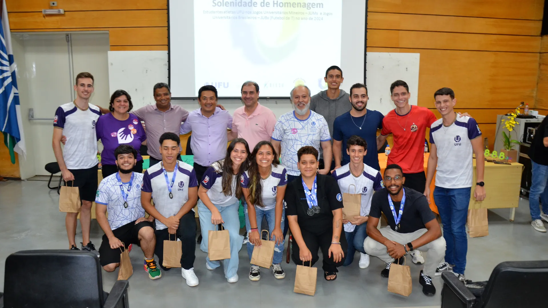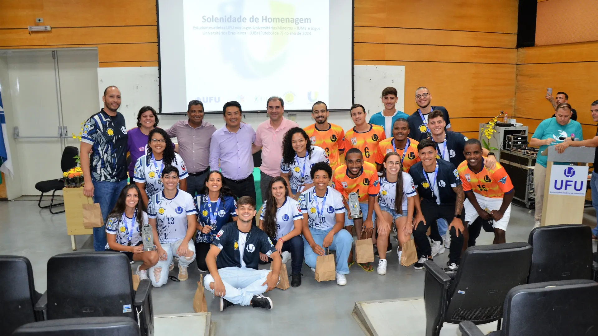 39 medalhas de ouro, 29 de prata e 15 bronzes nos Jogos Universitários Mineiros (JUMs) e um bronze inédito nos Jogos Universitários Brasileiros (JUBs) de Futebol, Fut7. X2 e Rugby. Estes são os resultados que foram celebrados na cerimônia de homenagem aos estudantes-atletas de Uberlândia que participaram das duas competições. O evento foi organizado pela Pró-Reitoria de Assistência Estudantil (Proae/UFU) e aconteceu no auditório do Bloco 3Q, na última quarta-feira, 17.