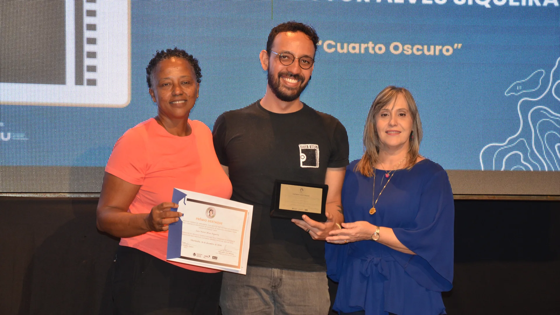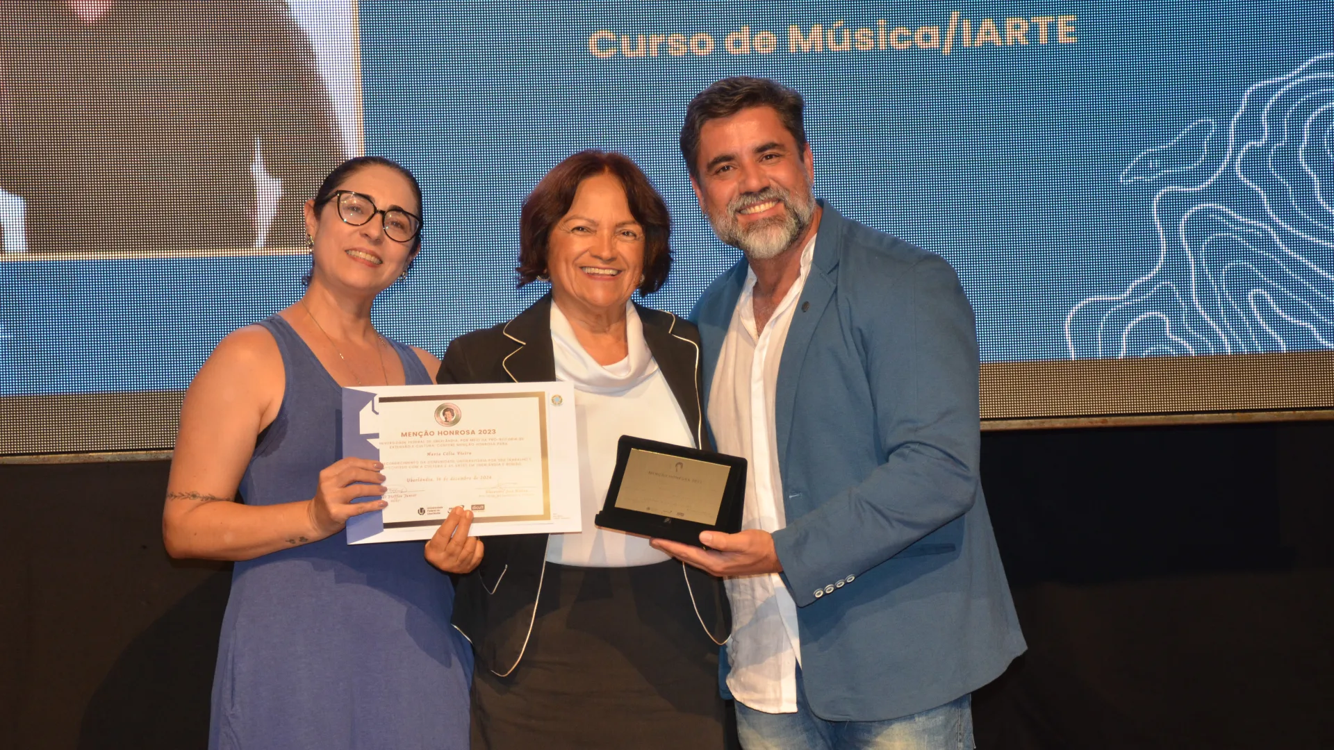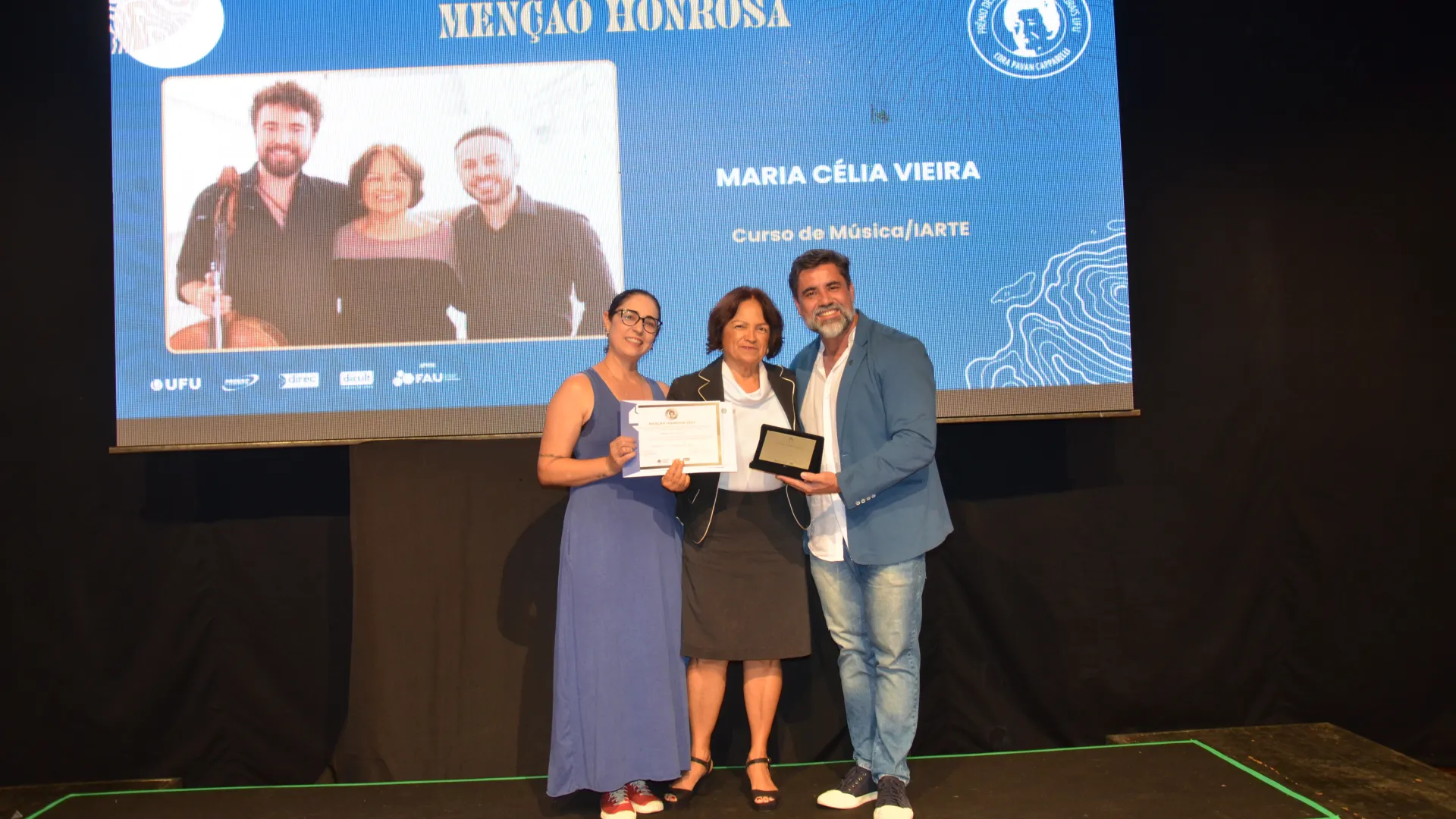 Enquanto o prêmio “Cora Capparelli” homenageou a professora Ivete Almeida, do Centro de Memória da Cultura Negra Graça do Aché; a professora Maria Célia Vieira, do curso de Música; e a professora Mara Lúcia Leal, do curso de Teatro. As menções honrosas são uma forma da Diretoria de Extensão, a de Cultura e o Instituto de Artes evidenciarem o papel que profissionais e projetos desempenham na universidade.