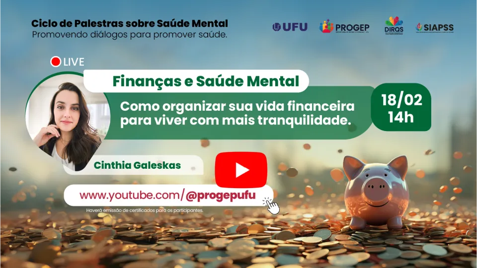 A Universidade Federal de Uberlândia (UFU) inicia neste mês o “Ciclo de Palestras sobre Saúde Mental: promovendo diálogos para promover saúde”, um projeto que visa ao bem-estar e a qualidade de vida dos servidores. A iniciativa será realizada durante todo o ano de 2025 e todas as ações serão transmitidas ao vivo, pelo canal da Pró-Reitoria de Gestão de Pessoas (Progep) no YouTube. A primeira live, “Finanças e Saúde Mental: como organizar sua vida financeira para viver com mais tranquilidade”, está programada para a próxima terça-feira, 18 de fevereiro, às 14h, e terá emissão de certificado.