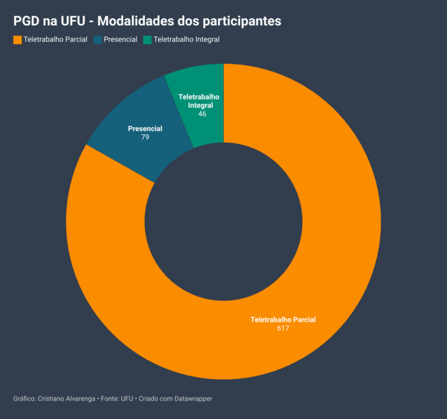 Atualmente, a UFU conta com 742 servidores atuando sob o PGD — aproximadamente 44% dos servidores da instituição (não inclui servidores vinculados ao Hospital de Clínicas). As modalidades são distribuídas da seguinte forma: