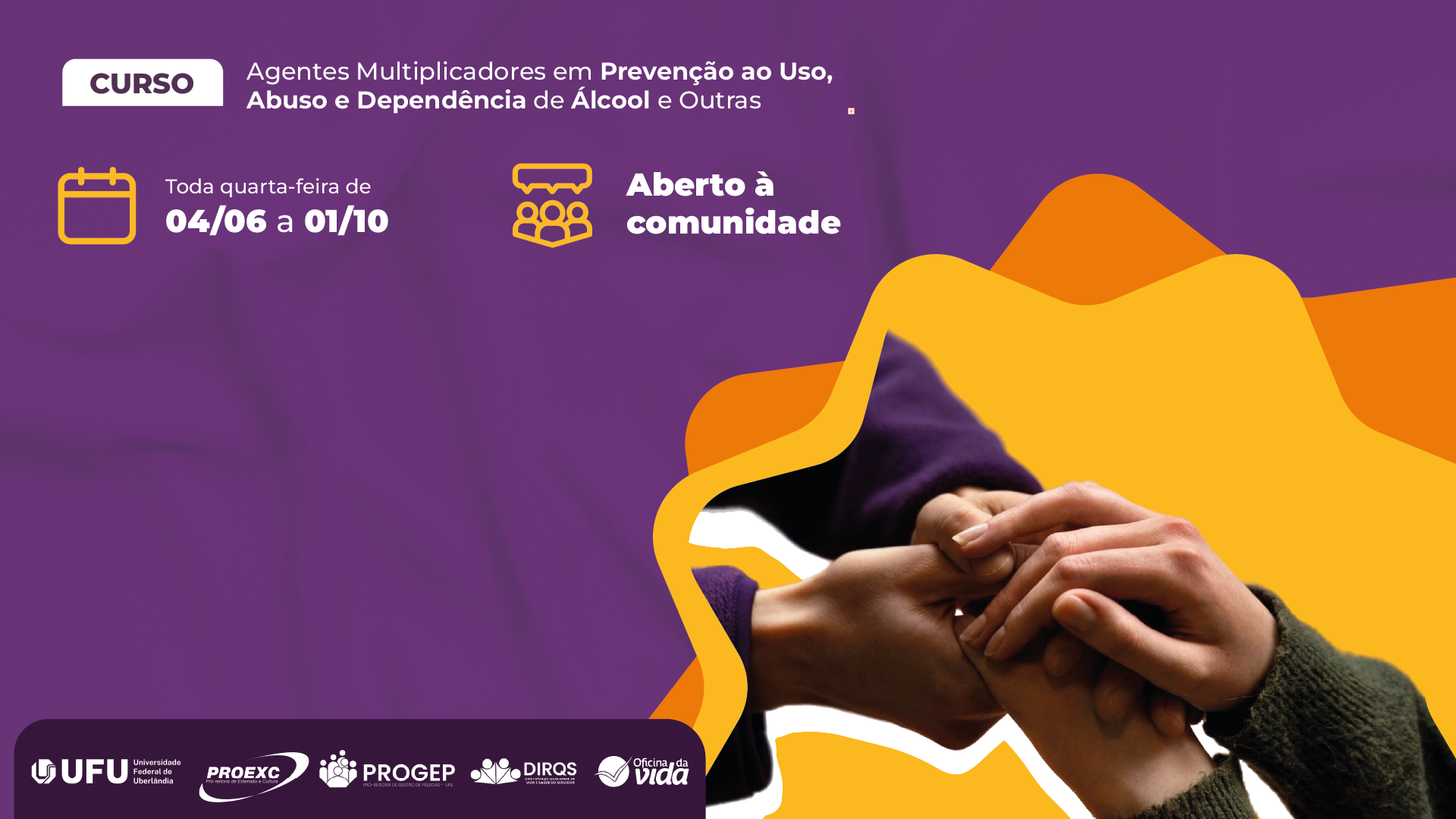 A Oficina da Vida, vinculada à Diretoria de Qualidade de Vida e Saúde do Servidor (Dirqs), promoverá o curso "Agentes Multiplicadores em Prevenção ao Uso, Abuso e Dependência de Álcool e Outras Drogas". O curso se iniciará no dia 4 de junho e as ações acontecerão todas as tardes de quarta-feira, até 1º de outubro. O projeto é aberto à comunidade e as inscrições para participar ficam abertas durante todo o mês de maio, com vagas limitadas.