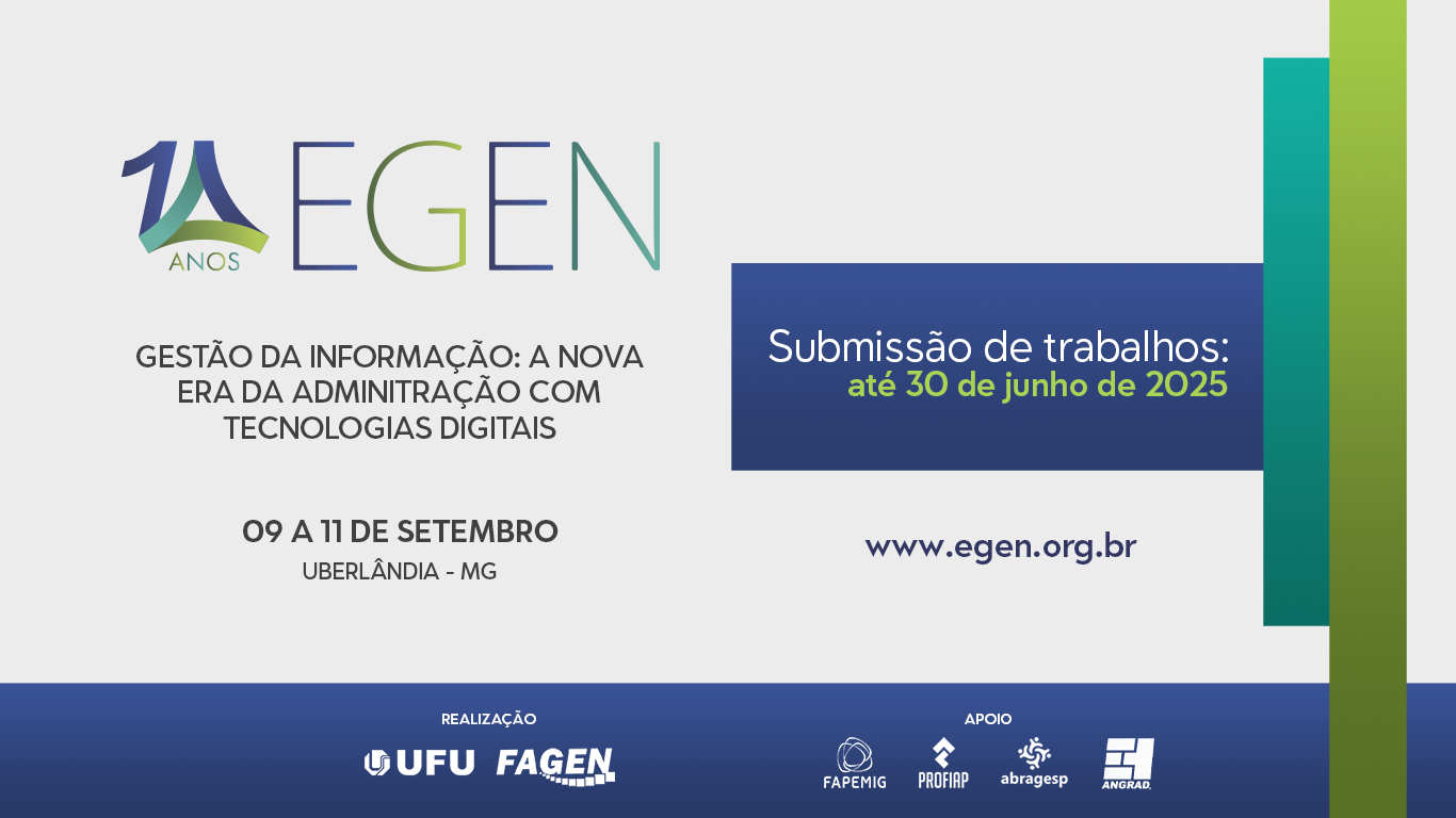 O Encontro de Gestão e Negócios (Egen) celebra seu 10º aniversário em 2025, consolidando-se como um dos eventos mais importantes da área no Brasil. Promovido pela Faculdade de Gestão e Negócios da Universidade Federal de Uberlândia (Fagen/UFU), o Egen é um evento bianual que reúne especialistas, acadêmicos e profissionais para discutir as últimas tendências e desafios da gestão de informações na era digital.