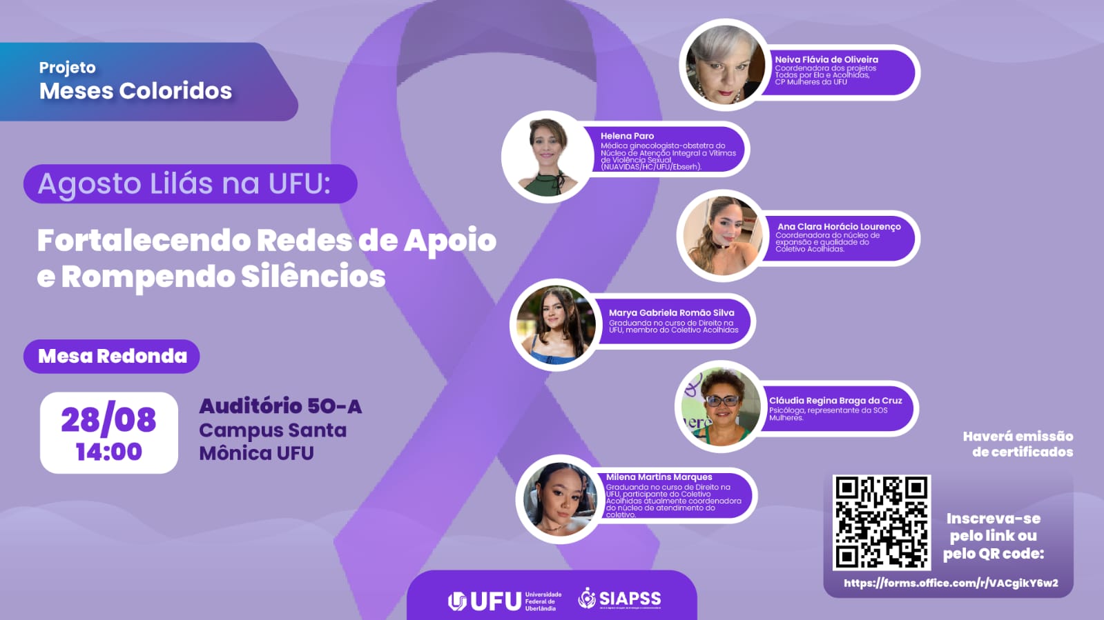 No dia 28 de agosto de 2025, quinta-feira, a Universidade Federal de Uberlândia (UFU) realizará a mesa-redonda “Agosto Lilás na UFU: Fortalecendo Redes de Apoio e Rompendo Silêncios”, evento que integra a campanha nacional de conscientização pelo enfrentamento à violência contra a mulher. A atividade acontece das 14h às 16h30, no auditório 5O-A ,do Campus Santa Mônica, e é aberta à comunidade interna e externa, com emissão de certificados. As inscrições são feitas por meio de formulário eletrônico.