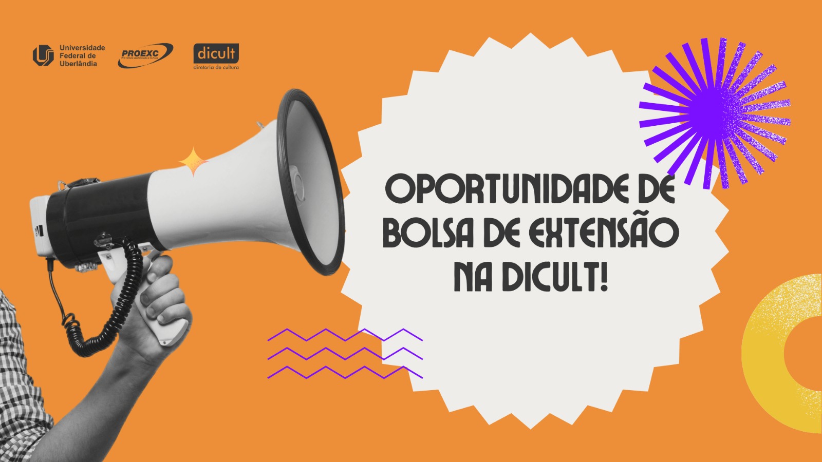 A Pró-Reitoria de Extensão e Cultura da Universidade Federal de Uberlândia (Proexc/UFU), por meio da Diretoria de Cultura (Dicult), torna público o edital para a seleção de bolsista de extensão. A vaga tem como foco o apoio em atividades administrativas – como atendimento ao público, digitação, elaboração de cronogramas e apoio na organização de eventos – na Dicult e na Divisão de Promoção Cultural (Diproc).