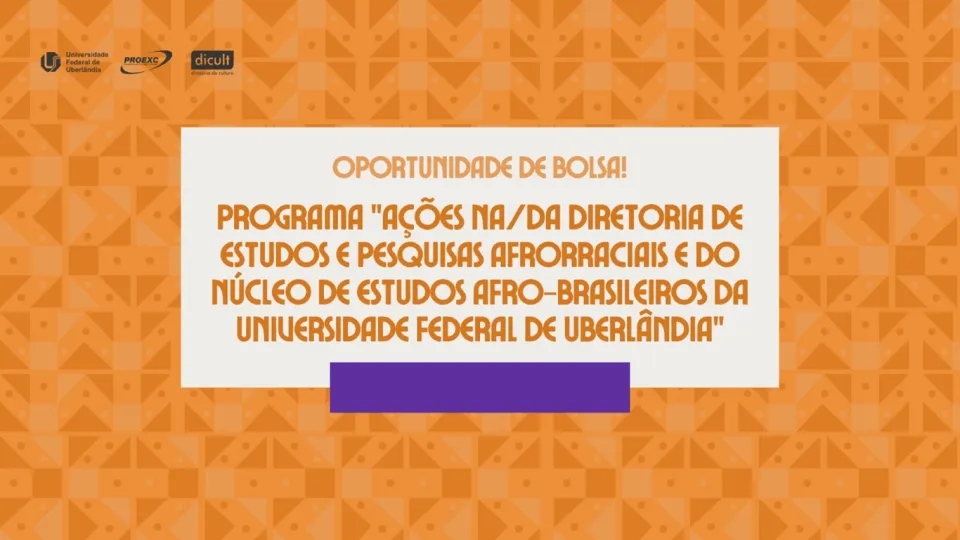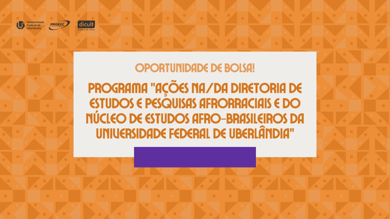 A Pró-Reitoria de Extensão e Cultura da Universidade Federal de Uberlândia (Proexc/UFU), publicou o edital para a seleção de bolsistas de extensão que irão atuar no programa "Ações na/da Diretoria de Estudos e Pesquisas Afrorraciais e do Núcleo de Estudos Afro-brasileiros da Universidade Federal de Uberlândia". Com bolsas mensais no valor de R$ 700,00, as vagas são direcionadas a alunos regularmente matriculados em cursos de graduação da instituição e que neles ingressaram por meio do sistema de cotas como negros, pardos, indígenas ou quilombolas.