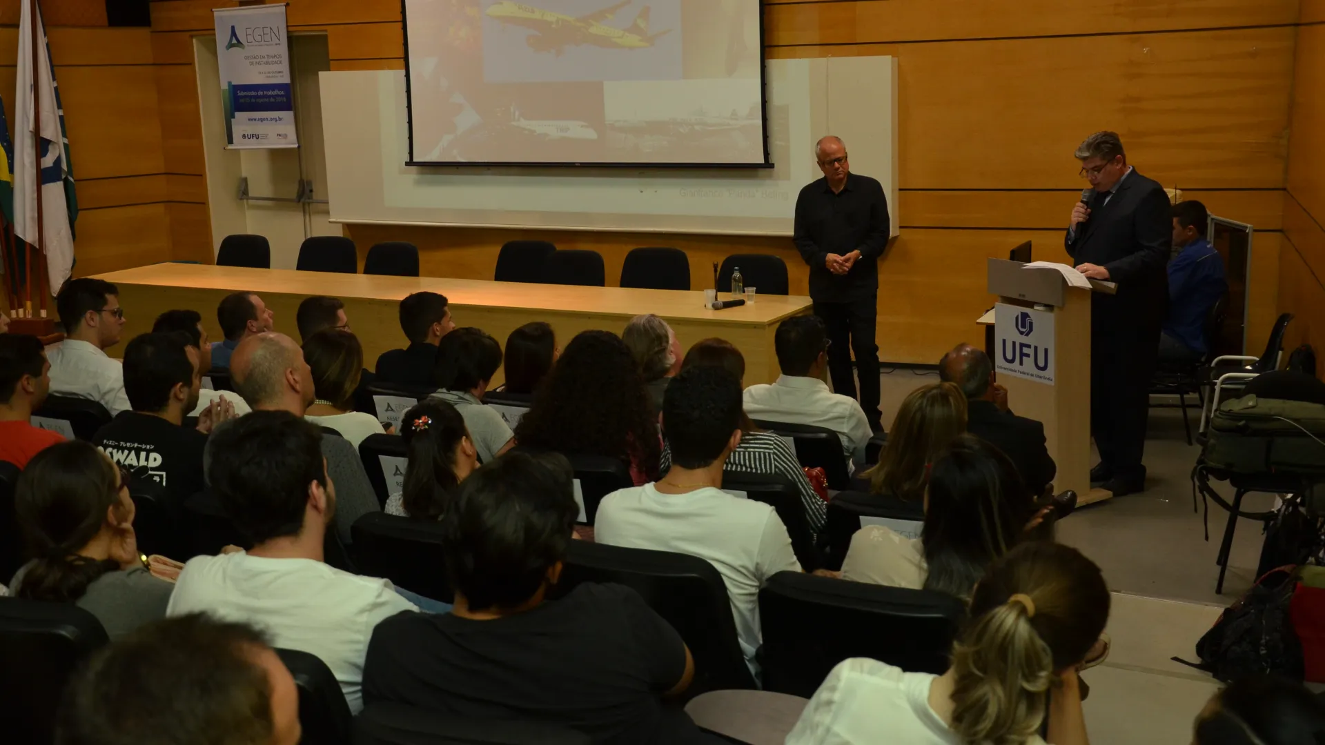 Aconteceu, na noite do dia 9/4, a palestra de lançamento do Encontro de Gestão e Negócios 2018 (Egen). O evento foi realizado pela Faculdade de Gestão e Negócios (Fagen) da Universidade Federal de Uberlândia (UFU). Com o tema "50 anos de gestão da aviação no Brasil", a palestra foi ministrada por um dos co-fundadores da companhia aérea Azul e diretor de Comunicação e Marketing da empresa, Gianfranco Beting. A programação ocorreu no Anfiteatro do Bloco 3Q, no Campus Santa Mônica, da UFU. No local, estiveram presentes representantes da universidade. (Fotos: Milton Santos)