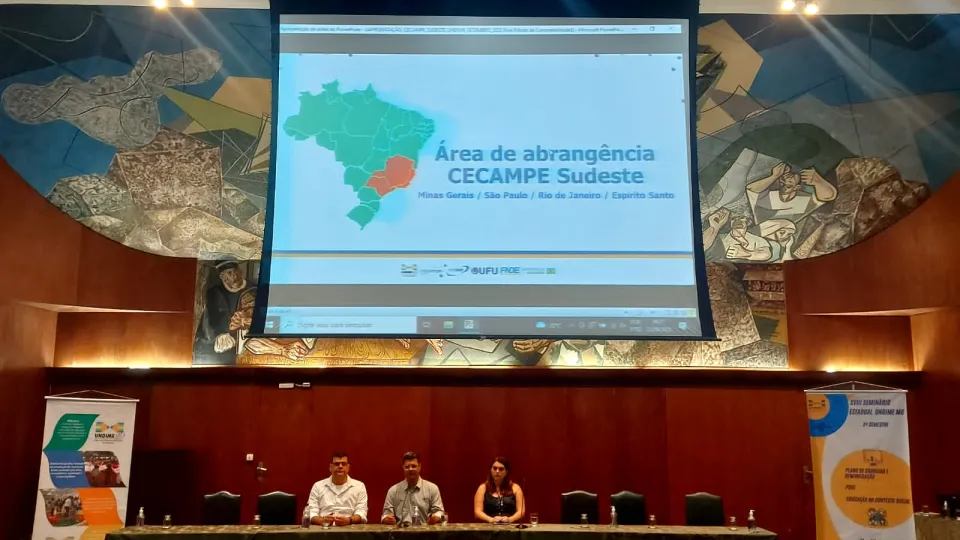 Integrante dos programas e ações institucionais da Pró-Reitoria de Extensão e Cultura da Universidade Federal de Uberlândia (Proexc/UFU), o Cecampe-Sudeste foi instituído em parceria com o Fundo Nacional de Desenvolvimento da Educação (FNDE) para desenvolver atividades de extensão, articuladas com o ensino e a pesquisa. Seu objetivo é promover o aprimoramento das políticas públicas educacionais e da gestão de programas e ações de apoio ao monitoramento e melhoria das condições das escolas públicas estaduais e municipais, além de escolas filantrópicas elegíveis para o "Programa Dinheiro Direto na Escola" (PDDE) e suas ações integradas. Dando sequência às atividades, uma equipe do Cecampe-Sudeste, capitaneada por seu coordenador, o professor Cairo Mohamad Ibrahim Katrib, da Faculdade de Educação (Faced), esteve em Belo Horizonte nos dias 21 e 22 de setembro, por ocasião do Seminário Estadual Undime MG - 2º Semestre. O evento, promovido pela União Nacional dos Dirigentes Municipais de Educação de Minas Gerais, foi realizado no auditório do Tribunal de Justiça de Minas Gerais e teve como temas centrais: "Plano de Carreira e Remuneração" e "Educação no Contexto Social e PDDE". (Fotos: Arquivo pessoal)