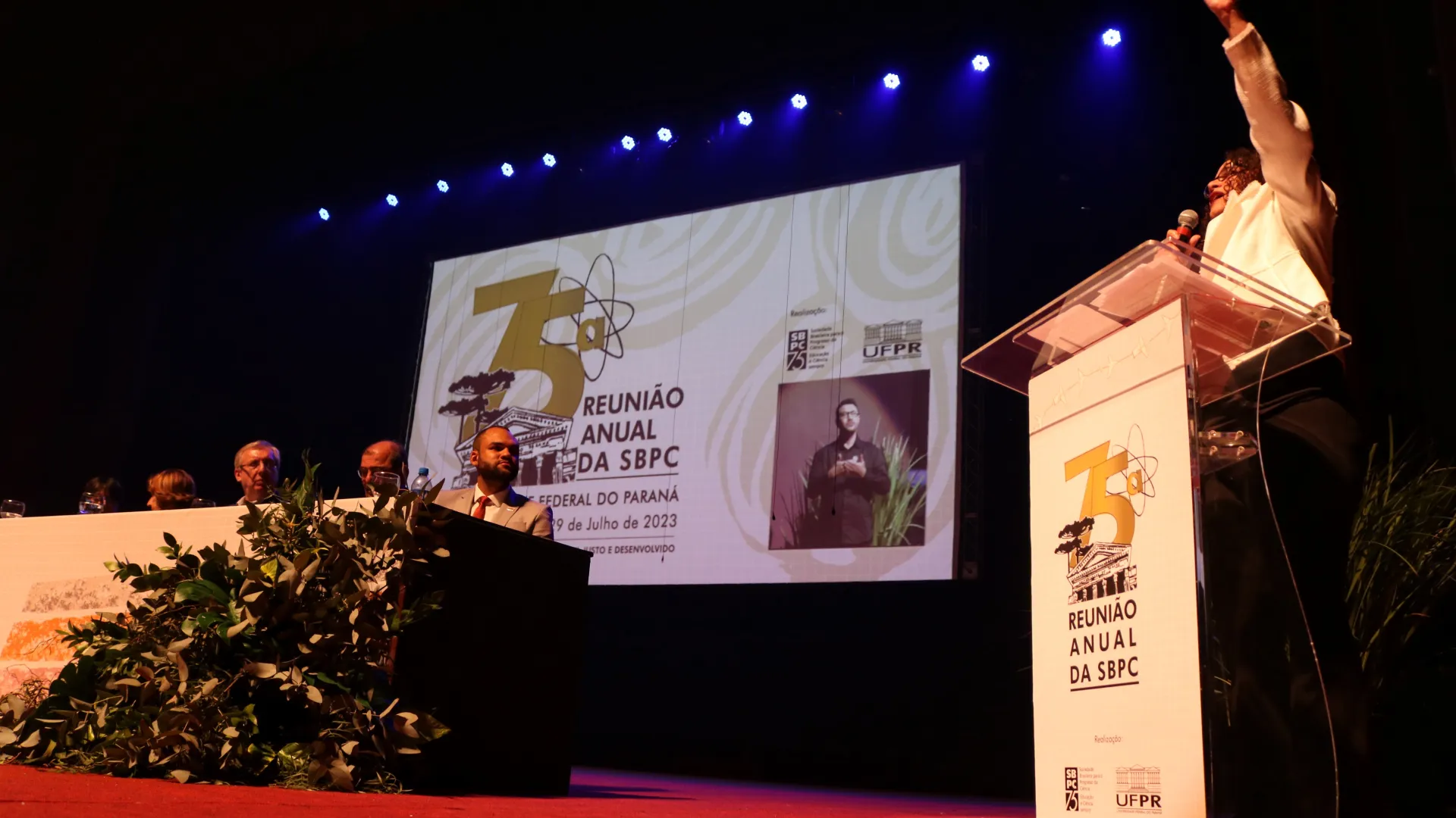 Veja as imagens da abertura da 75ª Reunião da Sociedade Brasileira para o Progresso da Ciência (SBPC). A cerimônia foi realizada no domingo (23/7), no Teatro Guaíra, em Curitiba (PR). (Fotos: Marco Cavalcanti/UFU)