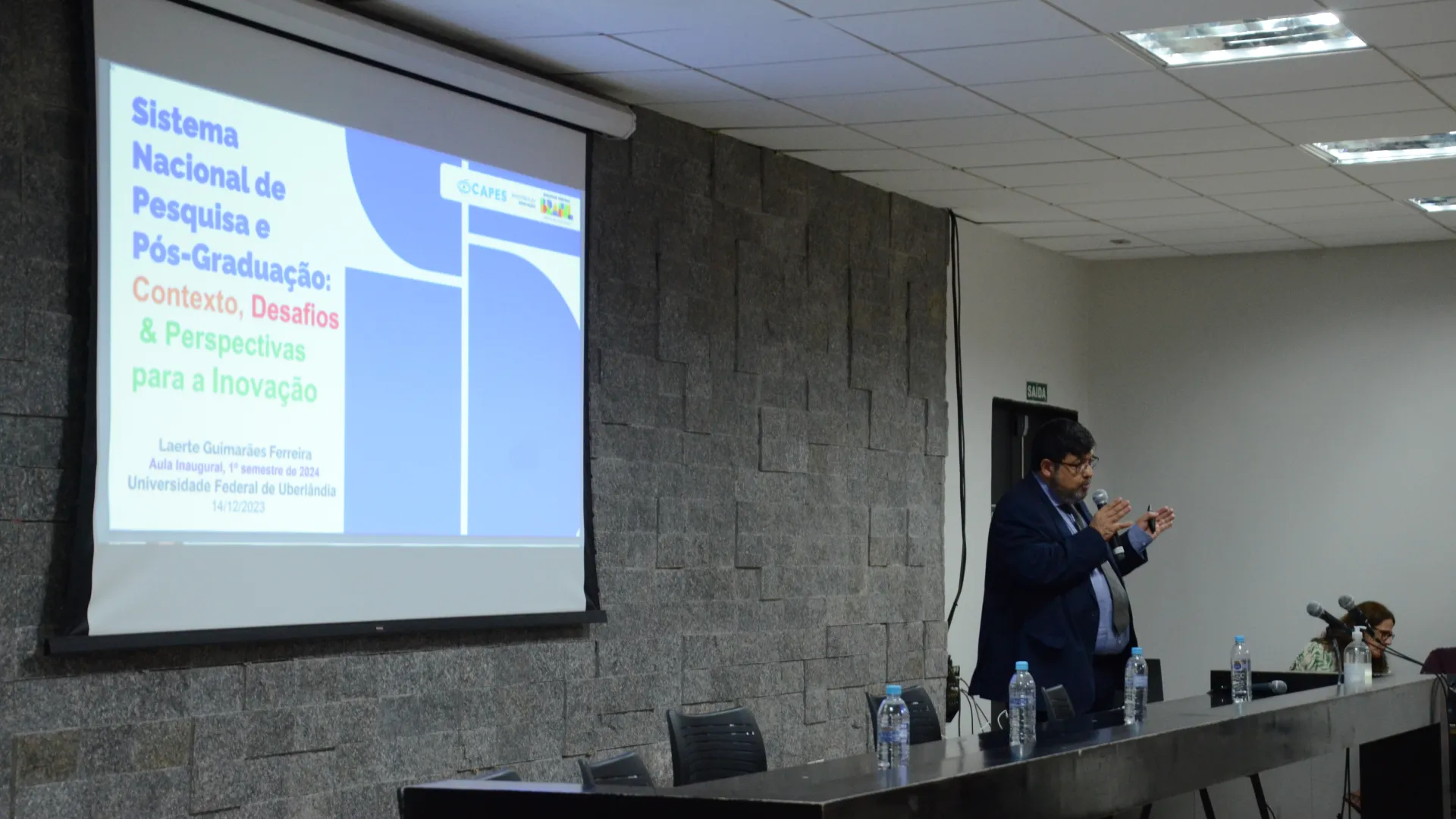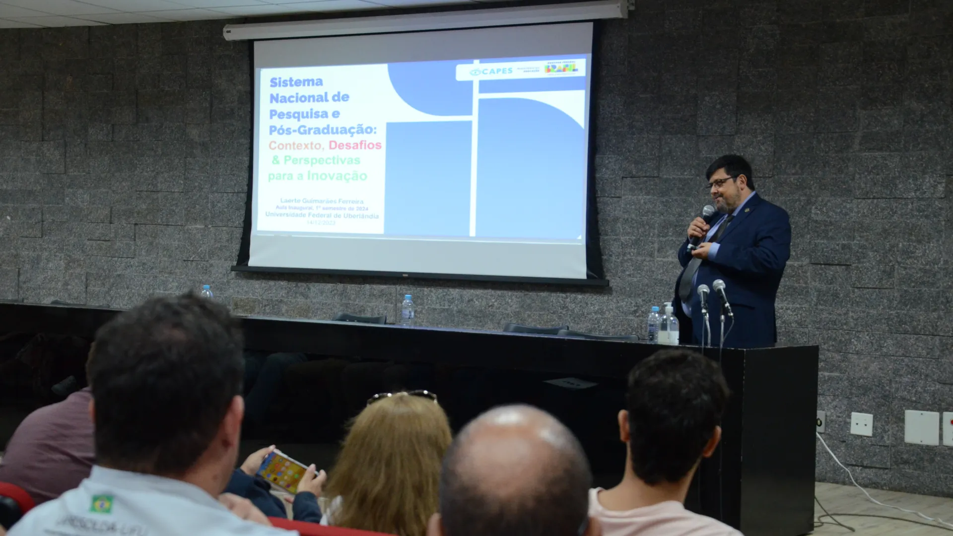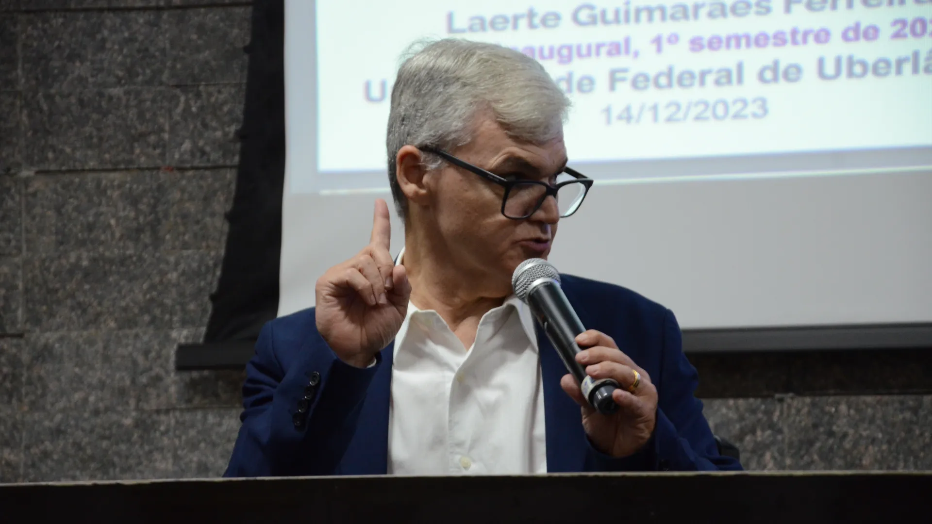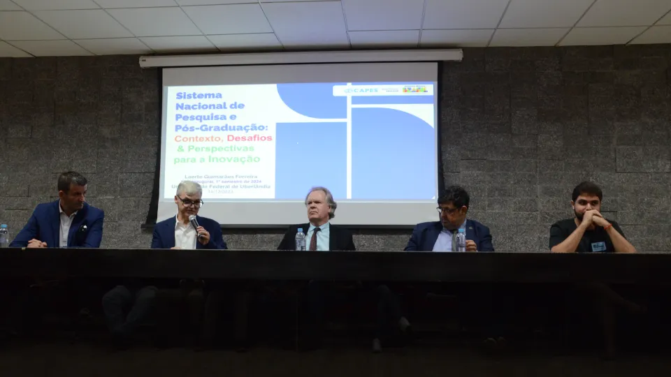 Na última quinta-feira (14) aconteceu a Aula Inaugural da Pós-Graduação da Universidade Federal de Uberlândia (UFU), como recepção do semestre 2024/1. Estiveram presentes o reitor da UFU, Valder Steffen Junior; o pró-reitor de Pesquisa e Pós-Graduação, Carlos Henrique de Carvalho; o representante da Associação de Pós-Graduandos (APG/UFU), Matheus Ávila; o reitor da Universidade Federal de Jataí, Christiano Coelho; e o diretor de Programas e Bolsas da Coordenação de Aperfeiçoamento de Pessoal de Nível Superior (Capes), Laerte Guimarães.