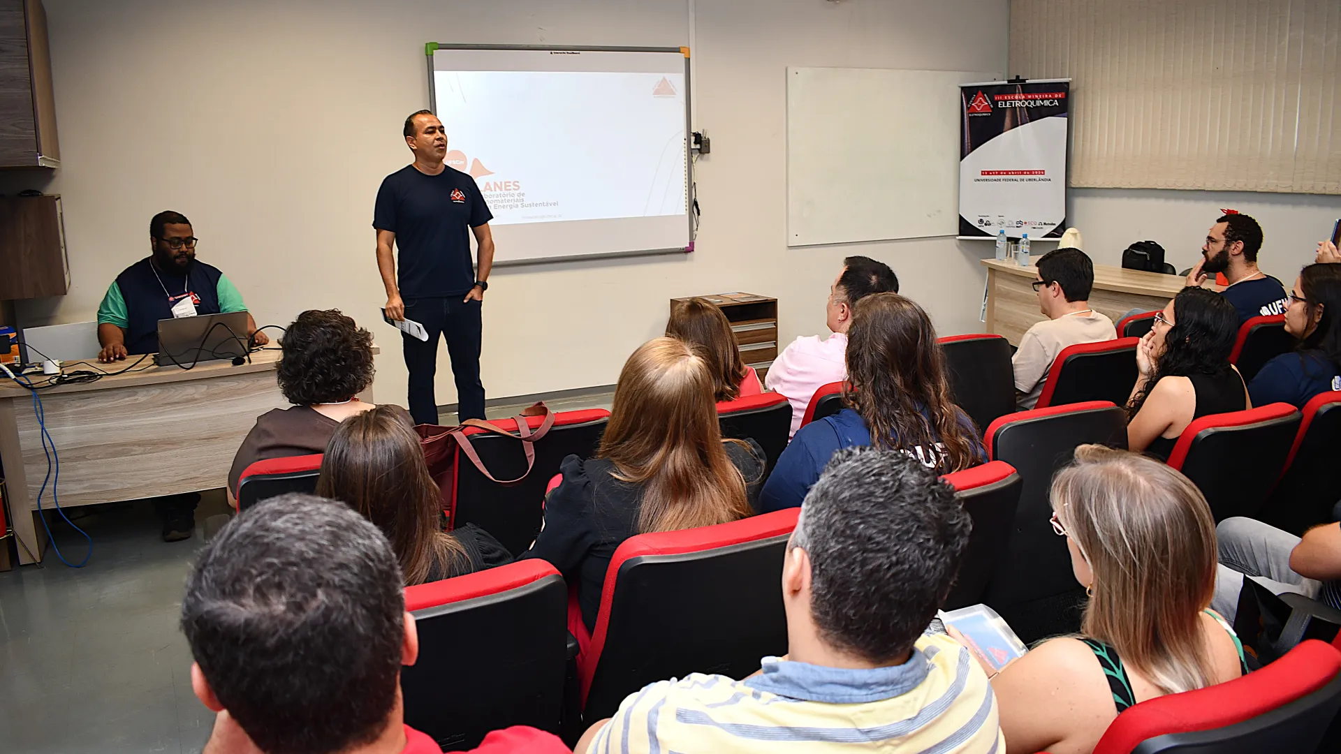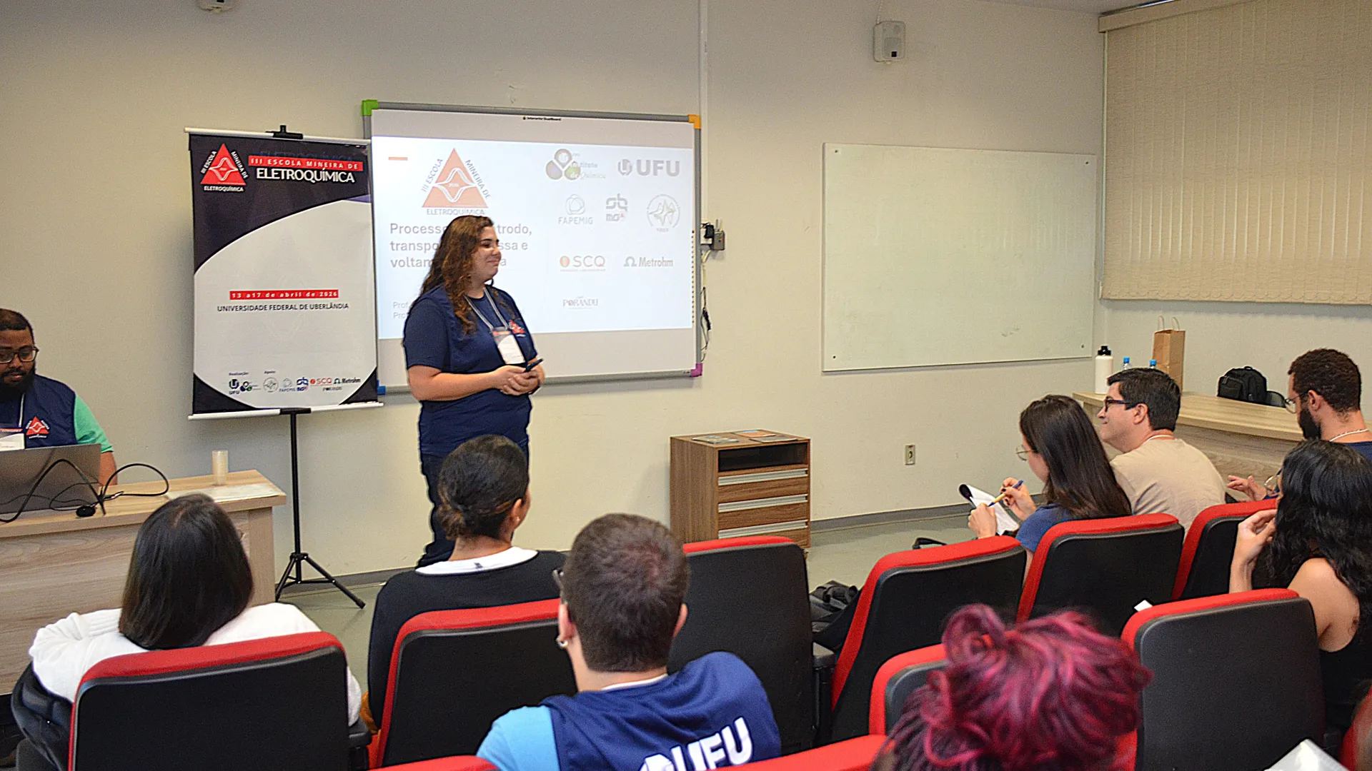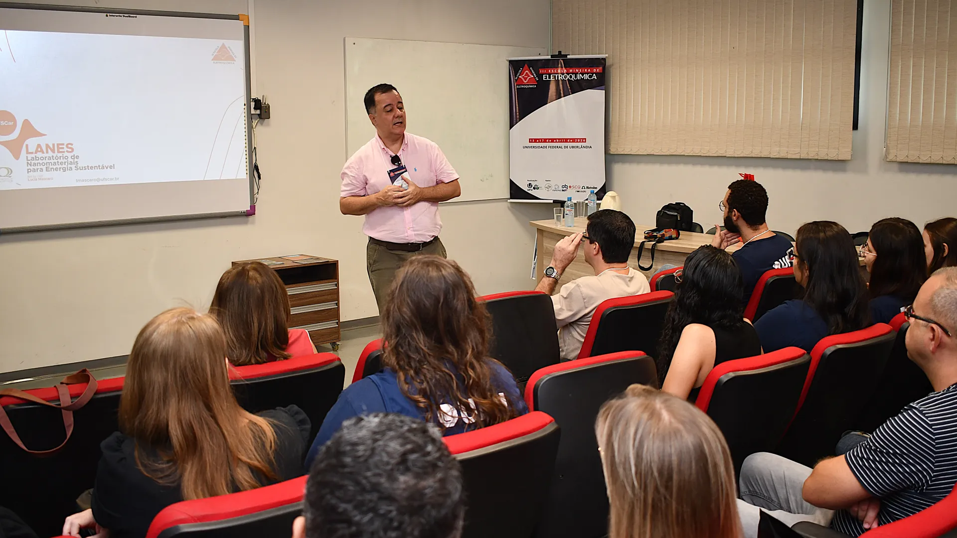 Ocorreu na última segunda-feira (13) no auditório do Bloco 5I a cerimônia de abertura da 3ª edição da Escola Mineira de Eletroquímica. O encontro conta com a presença de 25 estudantes de diferentes instituições de ensino. A programação engloba palestras, aulas teóricas, práticas e vivências em laboratório.